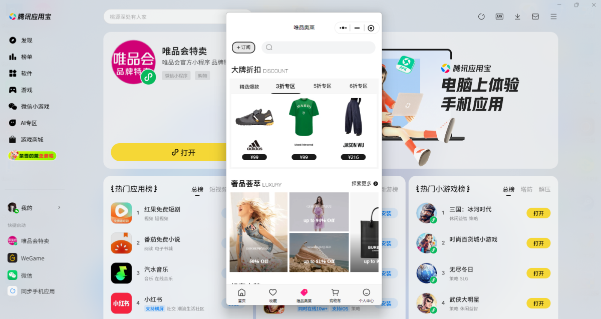 安卓版下载 大小:7.4MB 下载:3256次 唯品会特卖微信小程序电脑版 支 持:win10 分 类:电脑软件 大 小:7.4MB 版 本:V1.0 评 分: 开发者:极速下载站 下载量:3256次 发 布:2026-03-23 11:59 手机扫码免费下载 #唯品会特卖微信小程序电脑版截图 #唯品会特卖微信小程序电脑版简介 唯品会专注服装品牌特卖,大牌衣服品牌源头采买,100%正品保障。上唯品会,大牌衣服3折买!
