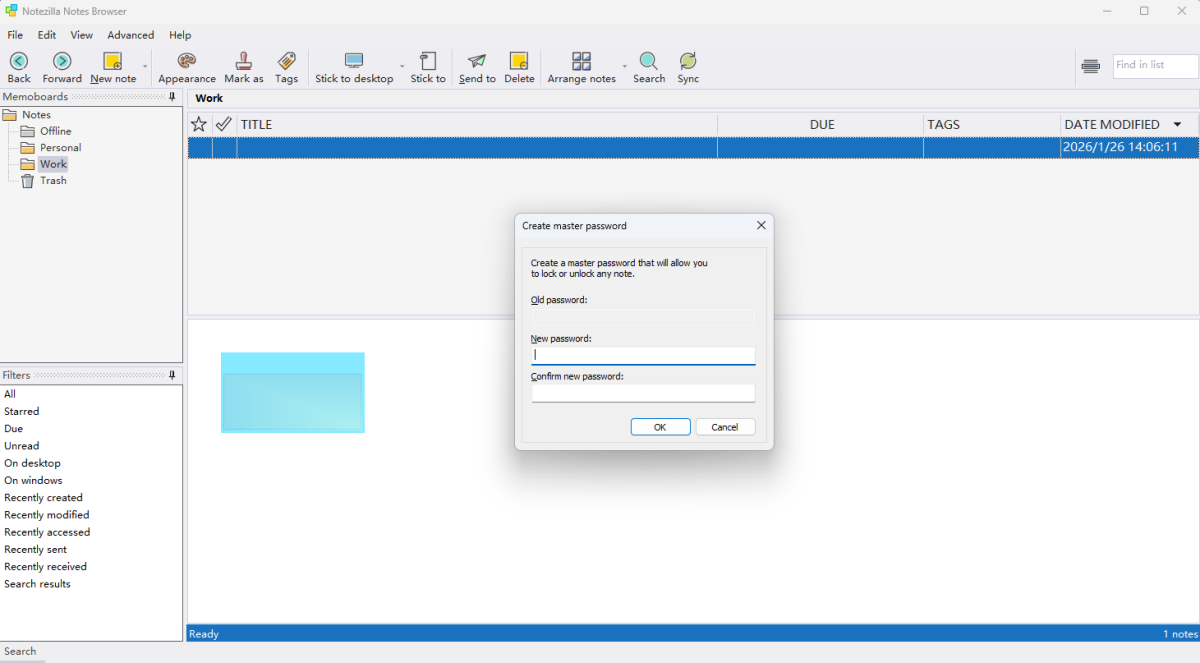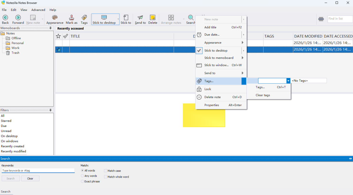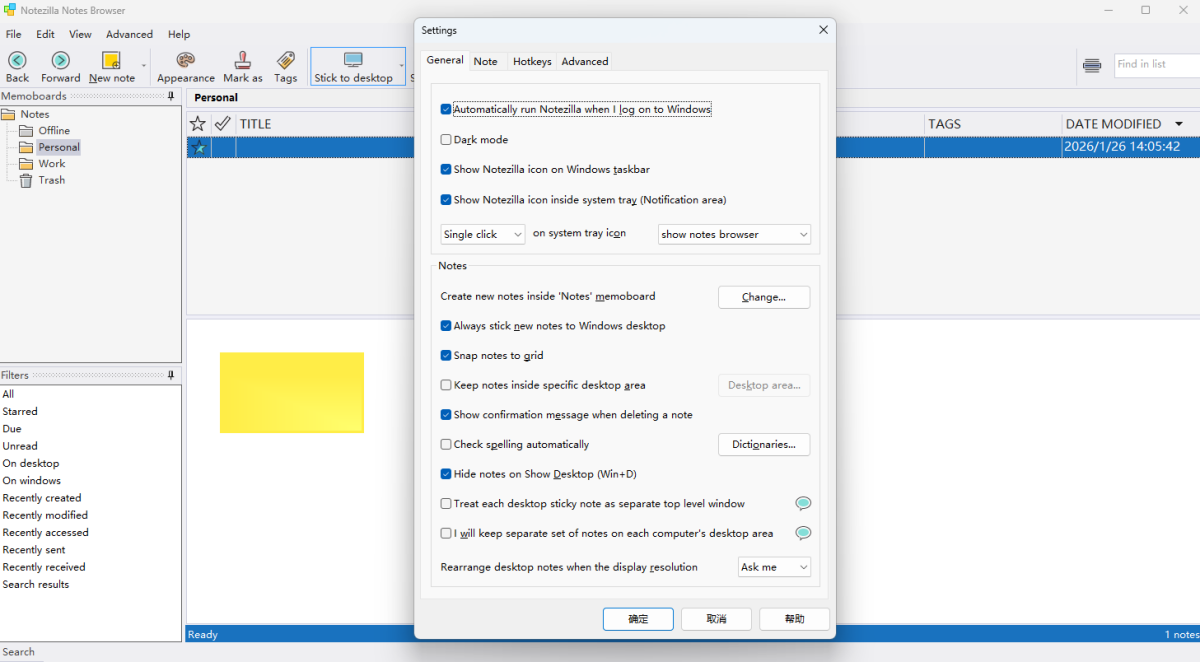 安卓版下载 大小:32MB 下载:3256次 NoteZilla 支 持:win10 分 类:电脑软件 大 小:32MB 版 本:正式版9.0.40.0官方版 评 分: 开发者:极速下载站 下载量:3256次 发 布:2026-03-23 12:00 手机扫码免费下载 #NoteZilla截图 #NoteZilla简介 NoteZilla是一款快速、灵活的windows记事软件,如同使用普通的纸制3M便利帖一样快速记笔记,可以在桌面上创建虚拟便签,记录想法、待办事项、备忘录等信息,软件支持各种自定义选项,如颜色、尺寸、字体等,用户可以根据个人喜好进行设置,Notezilla还有便捷的搜索功能和备份选项,确保用户的笔记安全可靠,用户还能在不同设备间同步笔记,随时随地访问自己的信息。